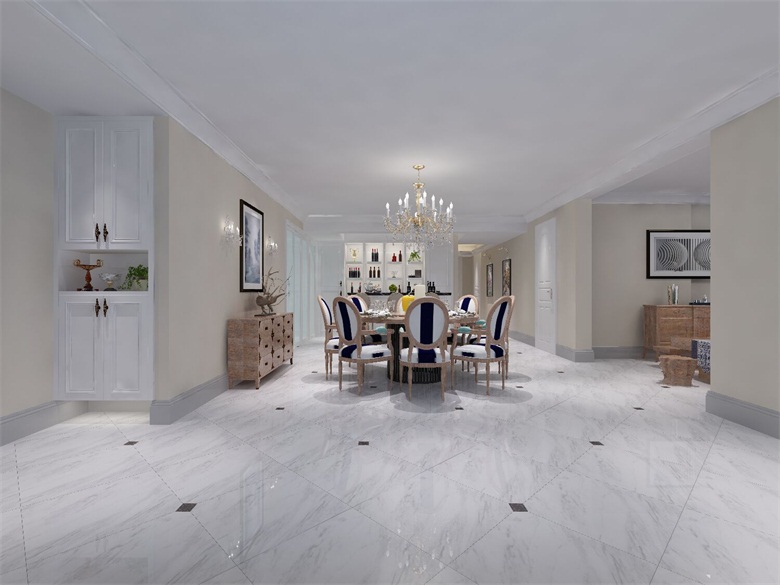 一幅精美的精装房软装设计效果图的构图,要分清层次,使画面具有深度的同时,广度也需更加丰富。如果缺少层次则感到平庸。如色彩从冷到暖,明度从亮到暗,纹理和材质从简单到复杂,造型从大到小、从方到圆、从高到低、从粗到细,构图从聚到散,质地从单一到复杂变化,空间形体虚与实等到都可以看成富有层次的变化。层次的变化可以轻松实现丰富的陈设效果,但需用恰当的比例关系和适合当前空间的层次需求,所以比较适宜的层次处理,才能够取得比较良好的软装视觉效果